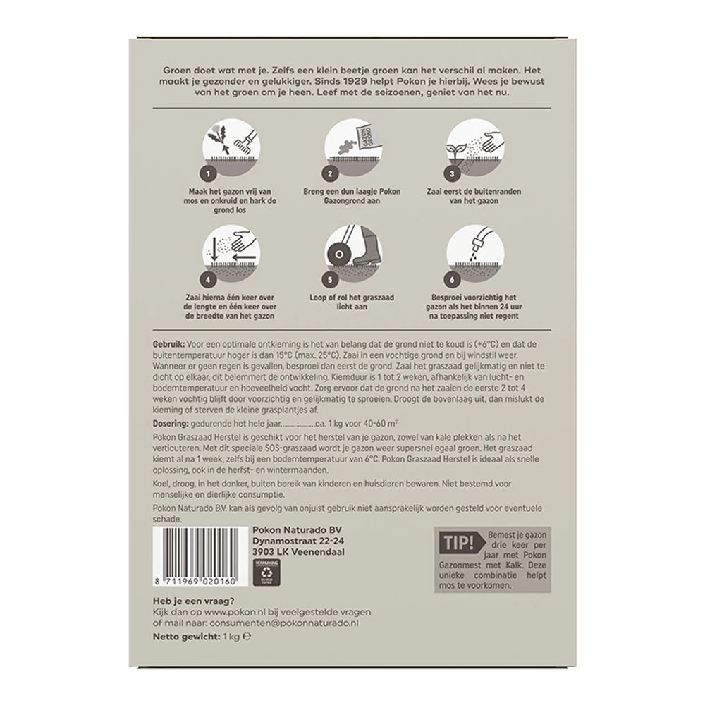 Pokon Graszaad Herstel is geschikt voor het herstel van je gazon, zowel van kale plekken als na het verticuteren. Met dit speciale SOS-graszaad wordt je gazon weer supersnel egaal groen. Het graszaad kiemt al na 1 week, zelfs bij een bodemtemperatuur van 6°C. Pokon Graszaad Herstel is ideaal als snelle oplossing, ook in de herfst- en wintermaanden. Voor een optimale ontkieming is het van belang dat de grond niet te koud is (+6°C.) en dat de buitentemperatuur hoger is dag 15°C (max 25°C). Zaai in een vochtige grond en bij windstil weer. Wanneer er geen regen is gevallen, besproei dan eerst de grond. Zaai het graszaad gelijkmatig en niet te dicht op elkaar, dit belemmert de ontwikkeling. Kiemduur is 1 tot 2 weken, afhankelijk van lucht- en bodemtemperatuur en hoeveelheid vocht. Zorg ervoor dat de grond na het zaaien de eerste 2 tot 4 weken vochtig blijft door voorzichtig en gelijkmatig te sproeien. Droogt de bovenlaag uit, dan mislukt de kieming of sterven de kleine grasplantjes af.