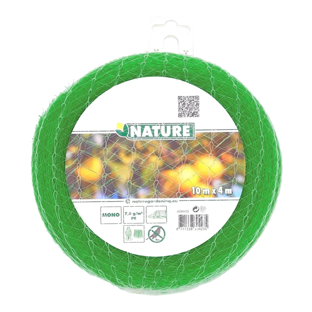 Groen uv-behandeld polyethyleennet met een dichtheid van 7,2 g/m². Het gebreide gaas is flexibel van formaat en het garen is 15 µ tot 16 µ dik. Het net kan maar één keer worden gebruikt. Dit tuinnet heeft een afmeting van 10x4m